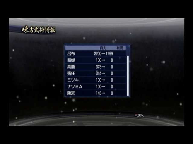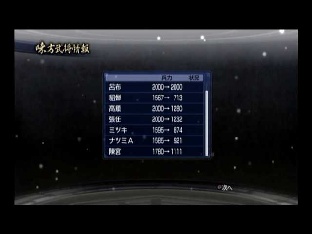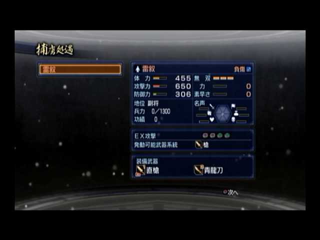 最速成長履歴保持者。10ターン前後ではLV4になるため、規律では精鋭騎兵が、知略では大火計、武勇では大喝を使われる