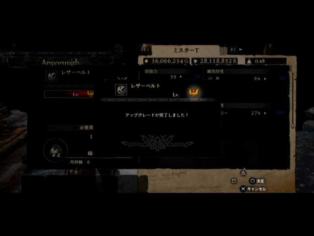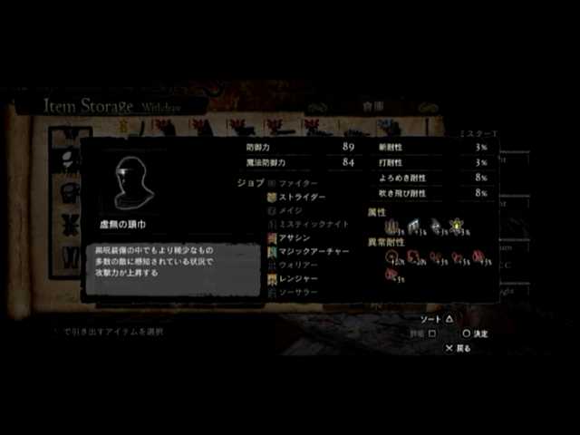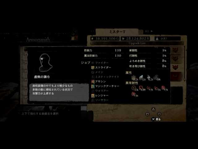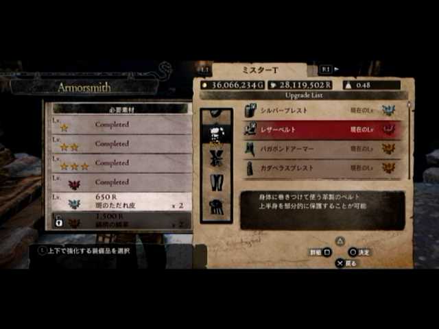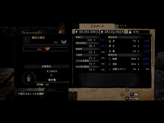 通常の密輸以外に、ファーストは頭装備と胸装備の強化をば。頭装備は虚無の頭巾、胸装備はレザーブレストです。前者の方は