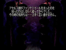 さあ、中盤戦はアセルス編に突入。多分会話総数は7シナリオ中、一番多いかも知れません。冒頭からエラい数の静止画で、