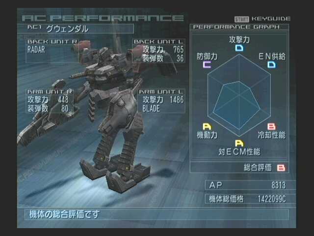| 〜ACパラメーター〜 AP 8313 WEIGHT 8035 レーダーレンジ 390 ACタイプ 近距離 チューニング カスタム パイロットタイプ ヒューマン 総合評価 B パイロット名 グウェンダル |