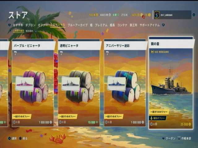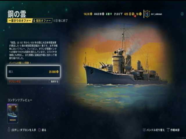 峰雲さん(日本ランク8駆逐艦)があり、25000ダブロンを支払えば入手はできます。が・・・駆逐艦が苦手な手前、こちら