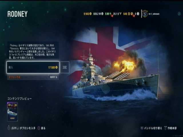 8段目と9段目と10段目と11段目は、イギリス戦艦ランク7はロドニー。先の割引きクーポンは同艦を入手するために得た